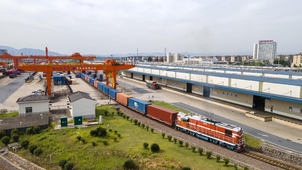 A China-Europe railway express fully loaded with cargos departs from the southern railway freight yard of the East China International Combined Transport Port (ICTP) in Jindong district, Jinhua city, east China's Zhejiang province, to Budapest, Hungary, July 9, 2024. (People's Daily Online/Hu Xiaofei)
