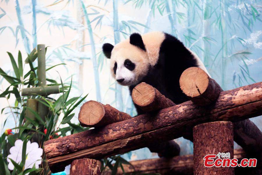 Giant panda cub Katyusha plays at Moscow Zoo in Russia, Aug. 24, 2024. (Photo: China News Service/Tian Bing)