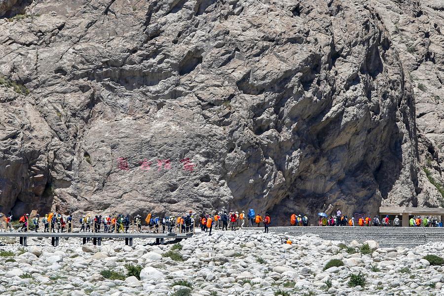 Hiking enthusiasts go for a hike on the Wusun ancient road in Baicheng County, northwest China's Xinjiang Uygur Autonomous Region, June 9, 2024. (Xinhua/Chen Shuo)