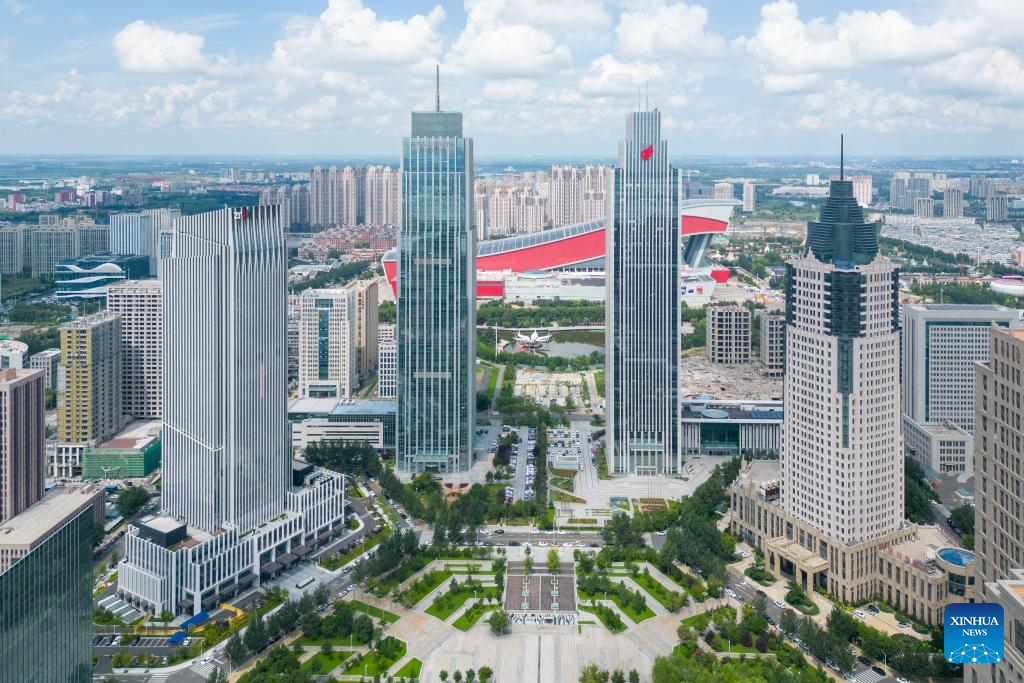 A drone photo taken on Aug. 15, 2024 shows a view of the Harbin sub-area of Heilongjiang pilot free trade zone (FTZ) in Harbin, northeast China's Heilongjiang Province. Known as China's "Ice City", Harbin has a reputation for its cool weather and diversified attractions, even during the summer months, which helps it remain attractive to tourists throughout the year. (Xinhua/Zhang Tao)