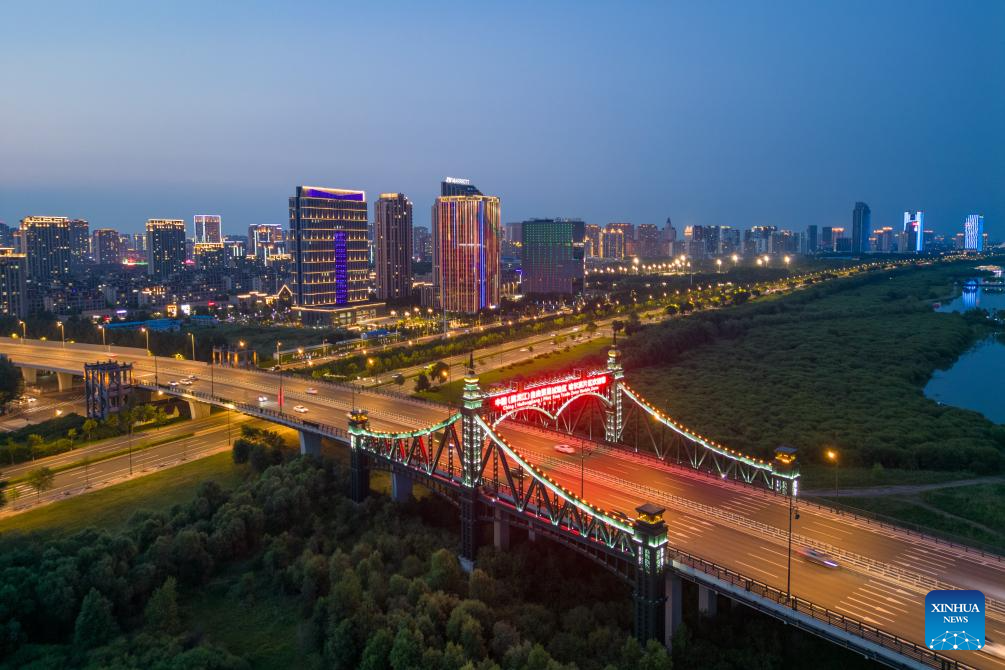An aerial drone photo taken on July 21, 2024 shows a night view of the sub-area of Heilongjiang pilot free trade zone (FTZ) in Harbin, northeast China's Heilongjiang Province. Known as China's "Ice City", Harbin has a reputation for its cool weather and diversified attractions, even during the summer months, which helps it remain attractive to tourists throughout the year. (Xinhua/Zhang Tao)