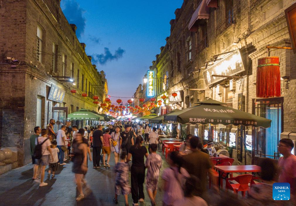 A drone photo taken on Aug. 16, 2024 shows people visiting a historical and cultural block in Harbin, northeast China's Heilongjiang Province. Known as China's "Ice City", Harbin has a reputation for its cool weather and diversified attractions, even during the summer months, which helps it remain attractive to tourists throughout the year. (Xinhua/Wang Jianwei)