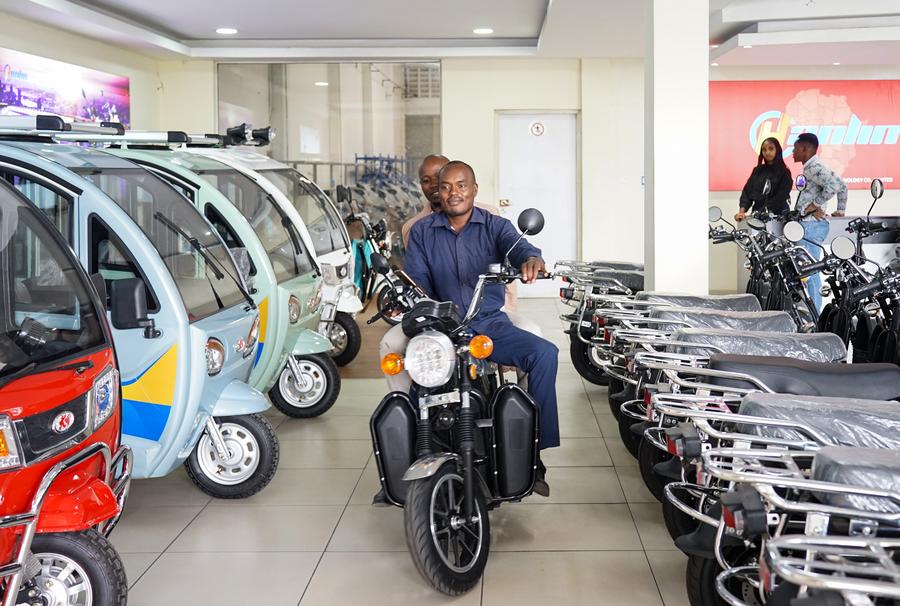 Consumers try an electric vehicle at Hanlin Africa New Energy Technology Company Limited in Nairobi, Kenya, on May 2, 2024. (Xinhua/Li Yahui)