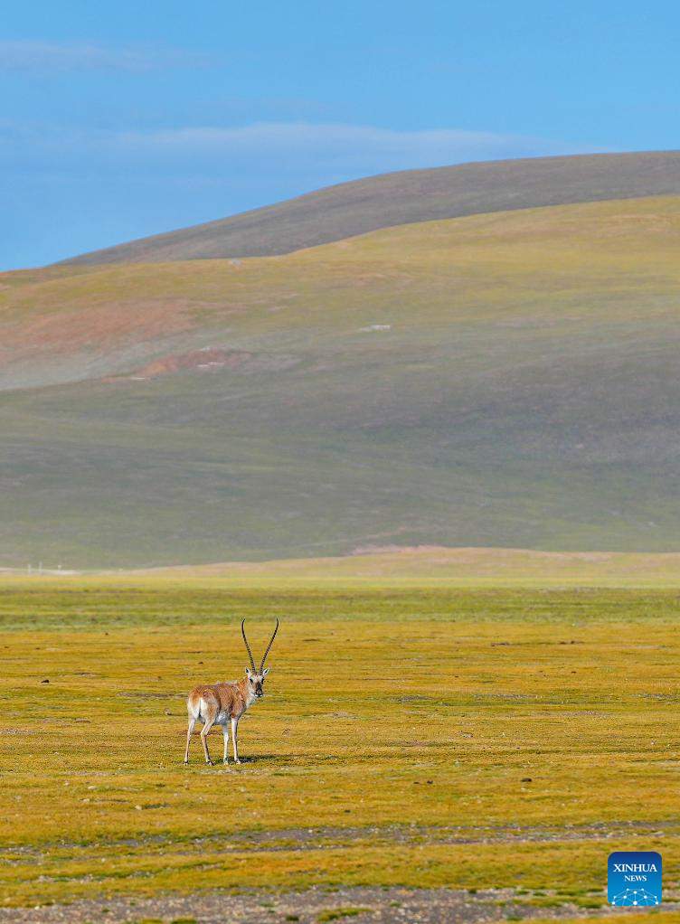 A Tibetan antelope is pictured in Serling Tso national nature reserve in Nagqu City, southwest China's Xizang Autonomous Region, Aug. 26, 2024. (Xinhua/Zhang Rufeng)