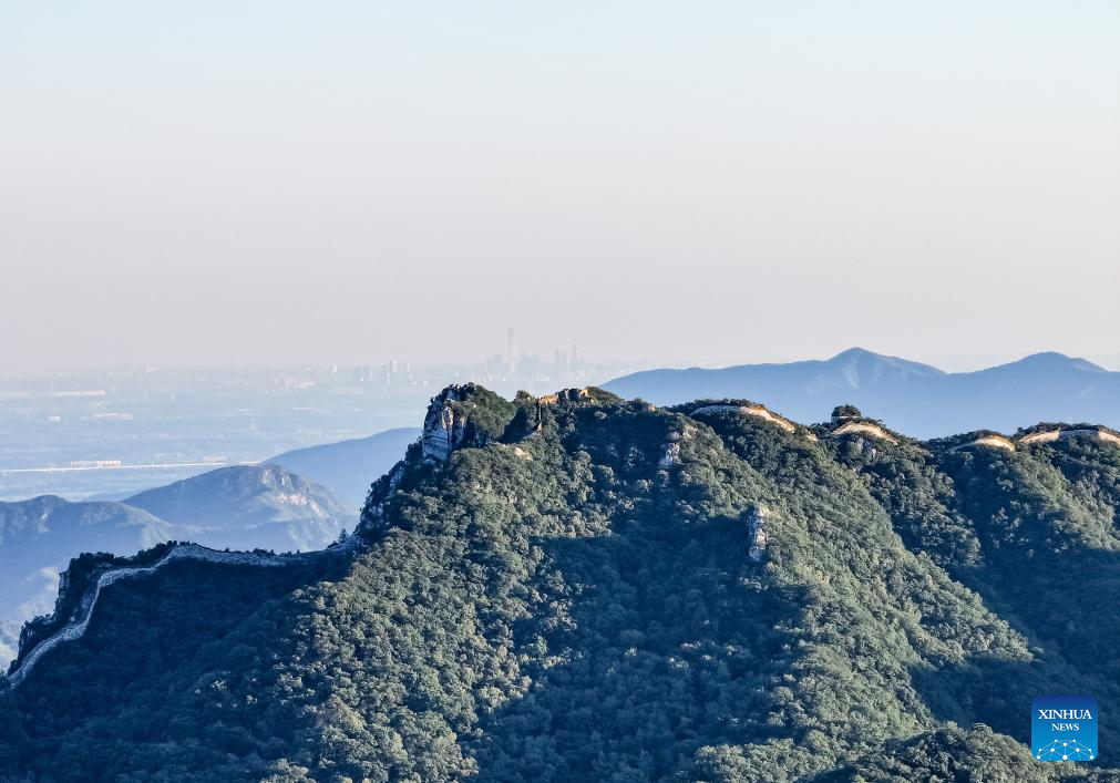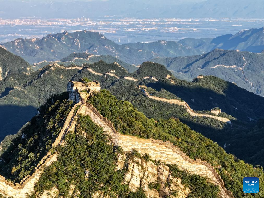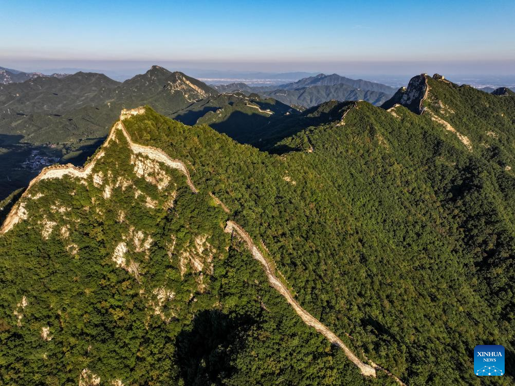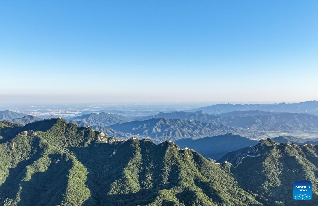 An aerial drone photo taken on Aug. 27, 2024 shows the Jiuyanlou and Jiankou sections of the Great Wall in Beijing, capital of China. (Xinhua/Chen Yehua)