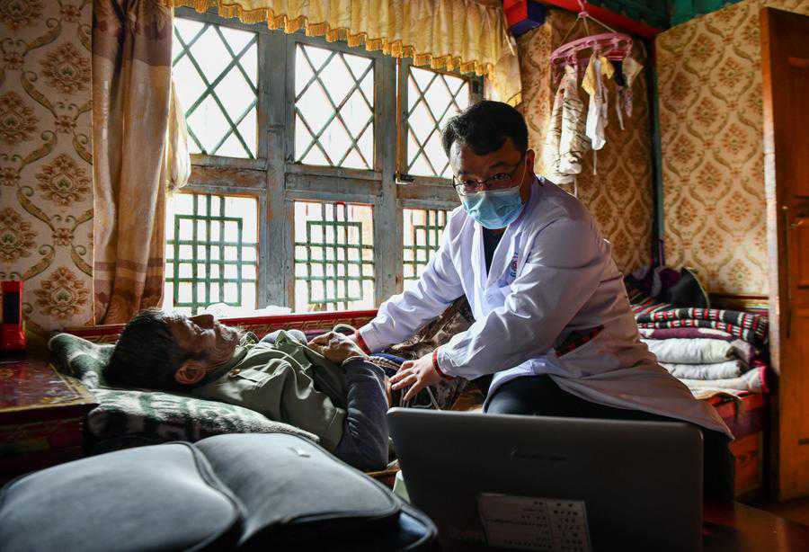 Wang Tongxu, doctor of a medical team from a hospital in Zhuhai, south China's Guangdong Province, treats a patient at a village in Mainling City, southwest China's Xizang Autonomous Region, June 12, 2023. (Xinhua/Jigme Dorje)