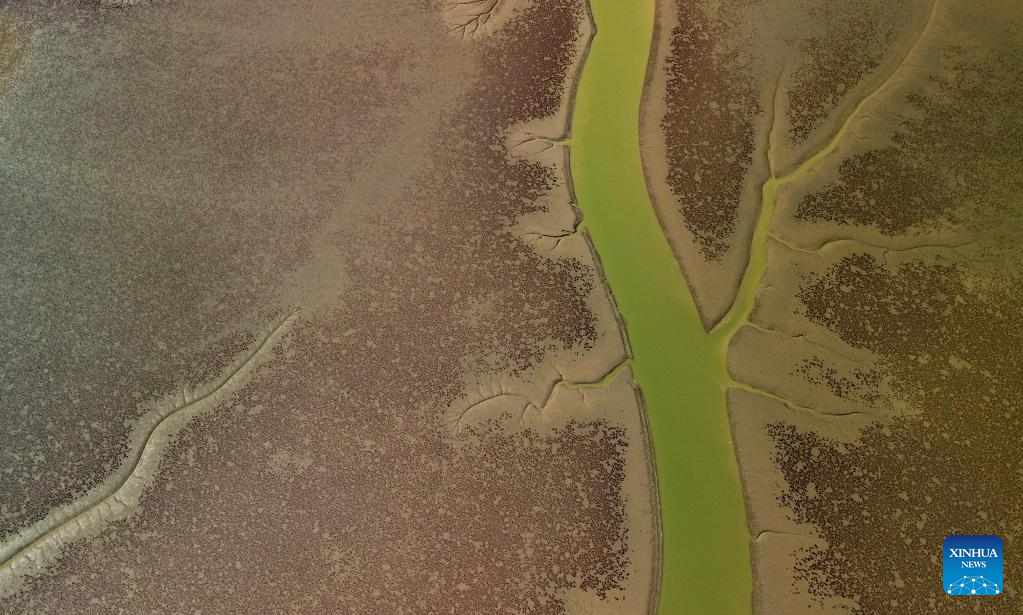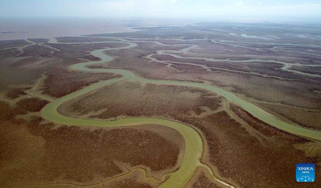 An aerial drone photo taken on Aug. 28, 2024 shows a view of the mudflats of the Yellow River Delta in Dongying, east China's Shandong Province. (Xinhua/Xu Suhui)