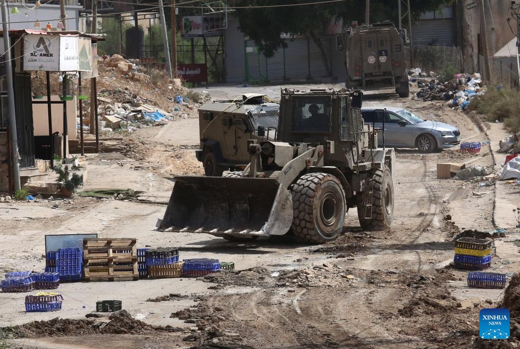 An Israeli military vehicle is seen during an Israeli operation in the Far'a refugee camp, to the south of the northern West Bank city of Tubas, on Aug. 28, 2024. At least 10 Palestinians were killed on Wednesday by Israeli shelling and gunfire in the northern West Bank, according to the Ramallah-based Palestinian Health Ministry. (Photo by Nidal Eshtayeh/Xinhua)