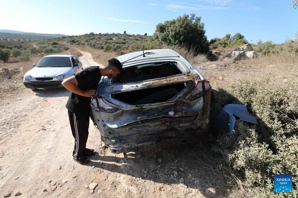 A Palestinian man inspects a vehicle attacked by Israeli warplanes in the Sir village, to the south of the northern West Bank city of Jenin, on Aug. 28, 2024. At least 10 Palestinians were killed on Wednesday by Israeli shelling and gunfire in the northern West Bank, according to the Ramallah-based Palestinian Health Ministry. (Photo by Nidal Eshtayeh/Xinhua)