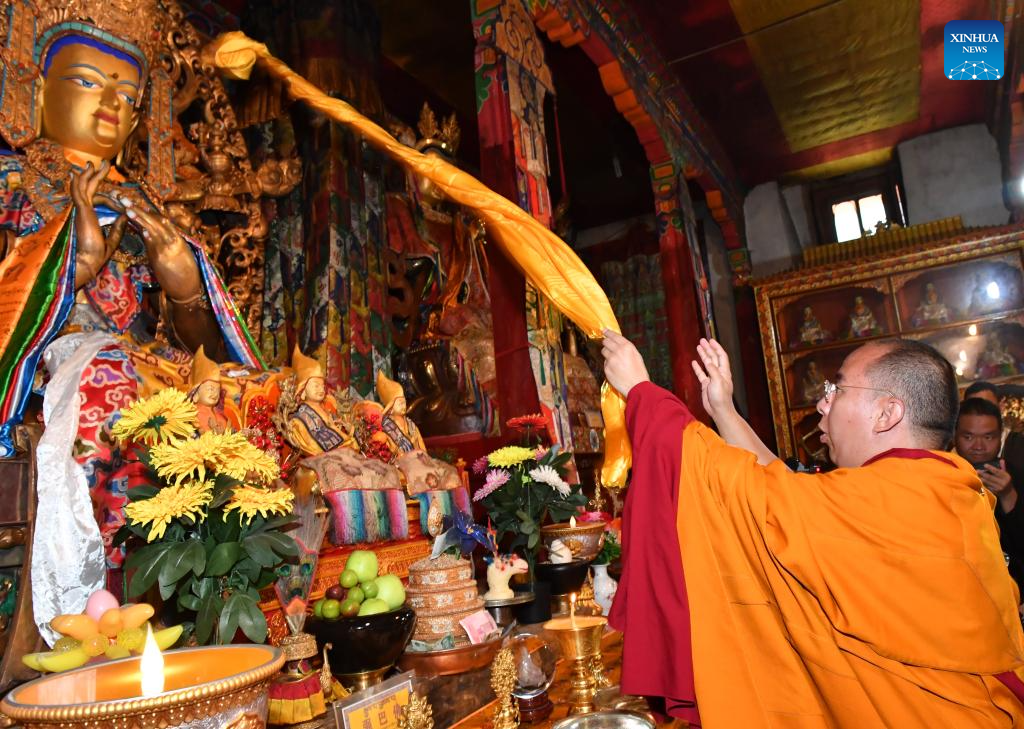 Panchen Erdeni Chos-kyi rGyal-po visits a Tibetan Buddhist monastery in Zayu County of Nyingchi City, southwest China's Xizang Autonomous Region, Aug. 26, 2024. (Photo by Chogo/Xinhua)