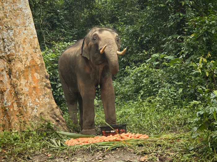 With a nimble trunk, the wild Asian elephant "Xiaoqiang" sifted through a pile of carrots on the ground. Eventually, it settled on two long, thick ones, curling them up with the front part of its trunk before devouring them.
