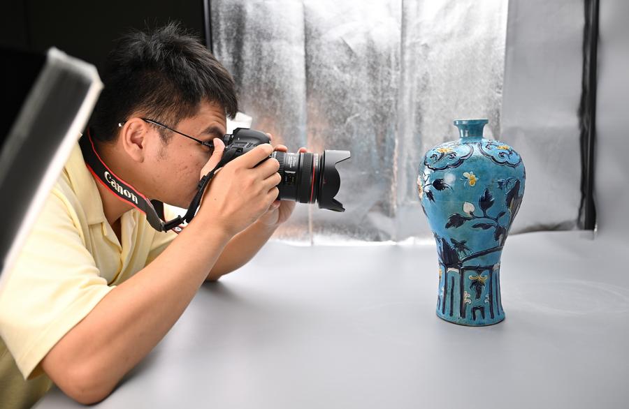 A staff member of China (Hainan) Museum of the South China Sea takes photos of cultural relics in Qionghai City, south China's Hainan Province, Aug. 27, 2024. (Xinhua/Guo Cheng)