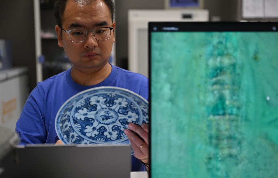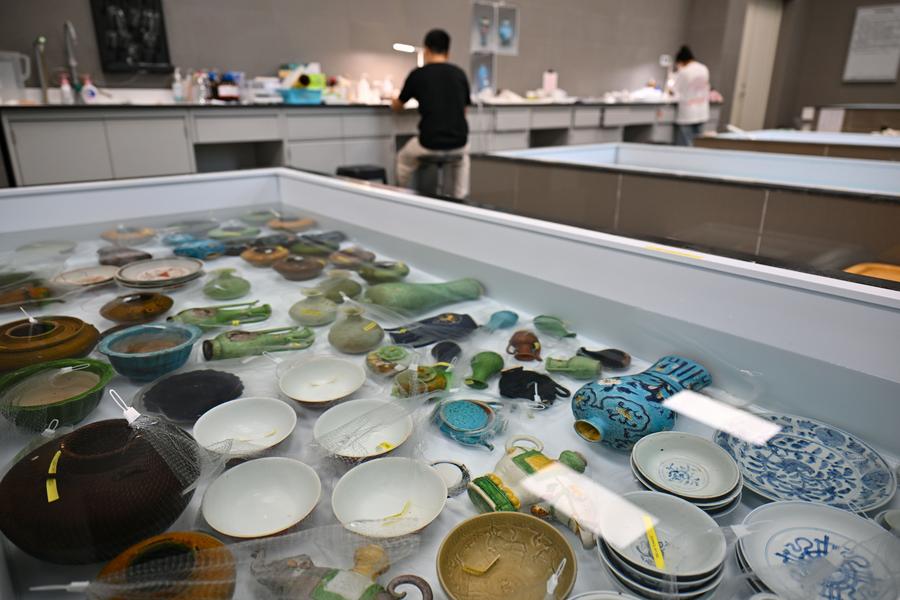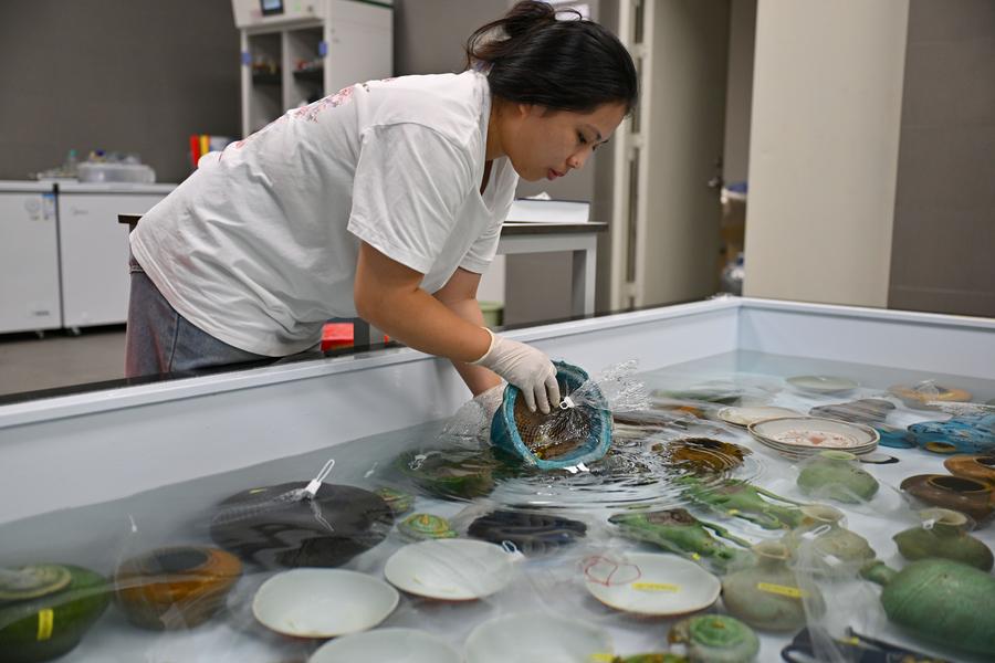 This photo taken on Aug. 27, 2024 shows cultural relics during desalination process in Qionghai City, south China's Hainan Province. (Xinhua/Guo Cheng)
