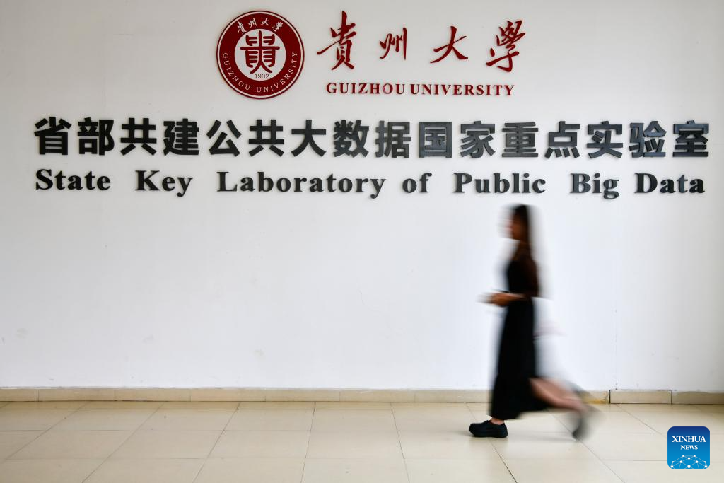 A staff member walks past the entrance of the State Key Laboratory of Public Big Data at Guizhou University in Guiyang, southwest China's Guizhou Province, Aug. 29, 2024. As the first of its kind in the field of big data in the country, Guizhou University's State Key Laboratory of Public Big Data has three stable research directions, including multi-source data fusion and integration technology, public big data security and privacy protection, block data and regional governance. (Xinhua/Yang Wenbin)
