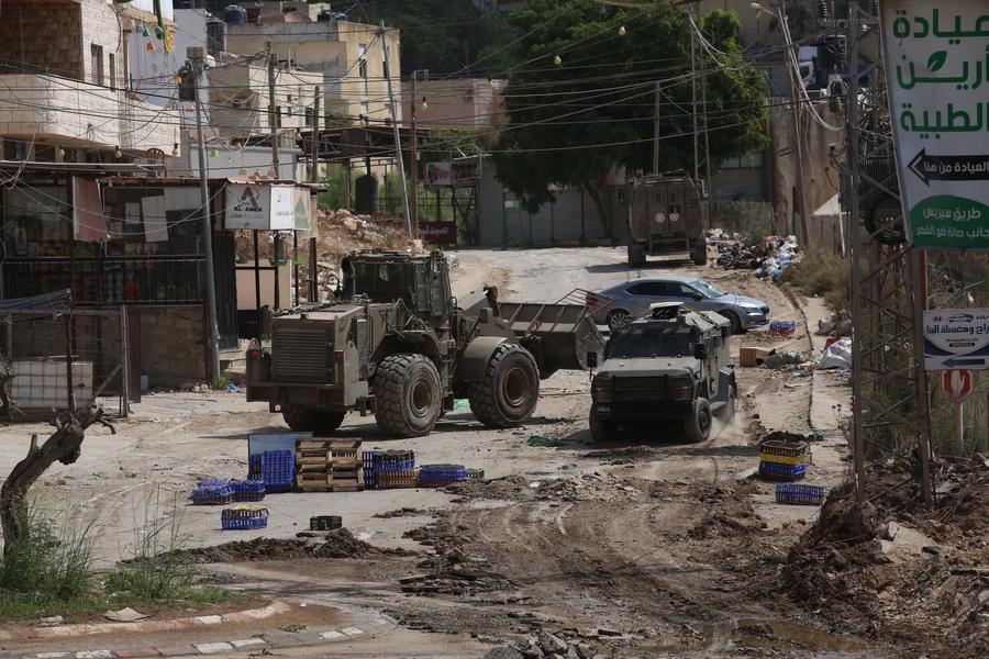 Israeli military vehicles are seen during an Israeli operation in the Far'a refugee camp, to the south of the northern West Bank city of Tubas, on Aug. 28, 2024. (Photo by Nidal Eshtayeh/Xinhua)
