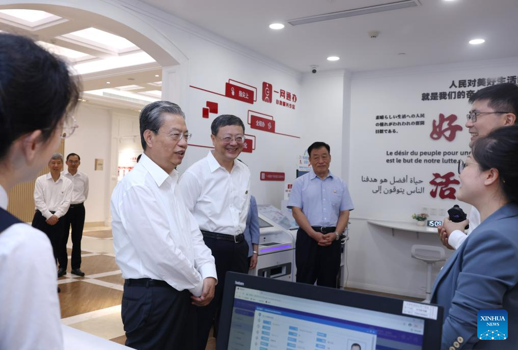 Zhao Leji, a member of the Standing Committee of the Political Bureau of the Communist Party of China Central Committee and chairman of the National People's Congress Standing Committee, visits the Gubei civic center in Shanghai, east China, Aug. 29, 2024. Zhao made an inspection tour in east China's Zhejiang Province and Shanghai Municipality that began on Wednesday and ended on Friday. (Xinhua/Liu Weibing)