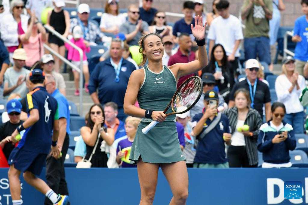 Zheng Qinwen of China celebrates after the women's singles third round match between Zheng Qinwen of China and Jule Niemeier of Germany at the 2024 US Open tennis championships in New York, the United States, on Aug. 30, 2024. (Xinhua/Li Rui)