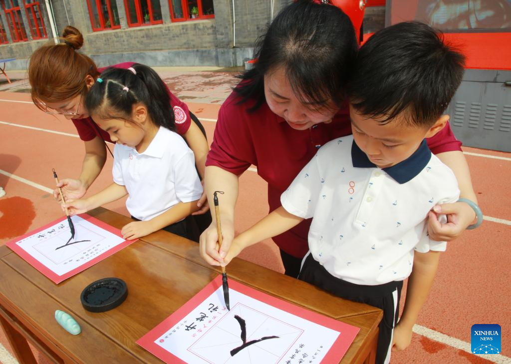 Students write Chinese character "Ren" at the opening ceremony of the new semester at a primary school in Dongcheng District, Beijing, capital of China, Sept. 1, 2024. Schools across China hosted activities to mark the start of the new semester on Sunday. (Xinhua/Xu Xiaoxuan)