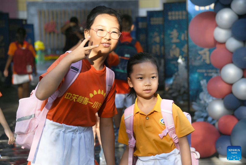 Students pose for a photo at a primary school in Haidian District, Beijing, capital of China, Sept. 1, 2024. Schools across China hosted activities to mark the start of the new semester on Sunday. (Xinhua/Ren Chao)