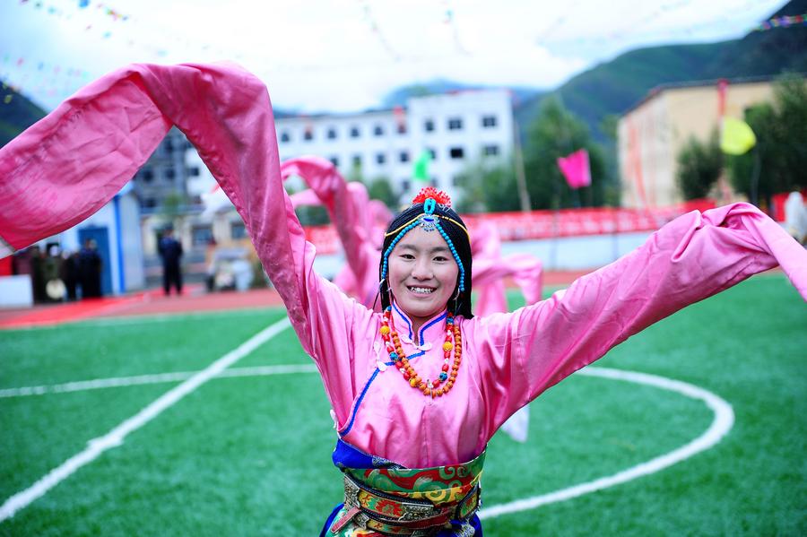Teachers perform dance during the completion ceremony of Sino-Congolese friendship primary school in Chengduo County of Yushu Tibetan Autonomous Prefecture, northwest China's Qinghai Province, July 22, 2012. (Xinhua/Zhang Hongxiang)