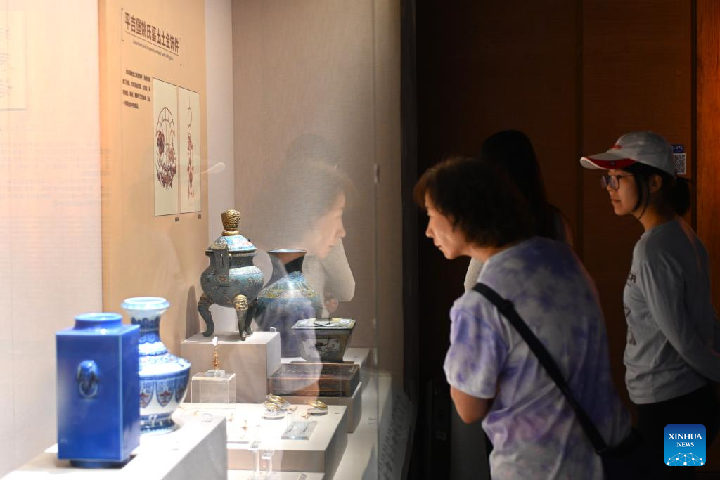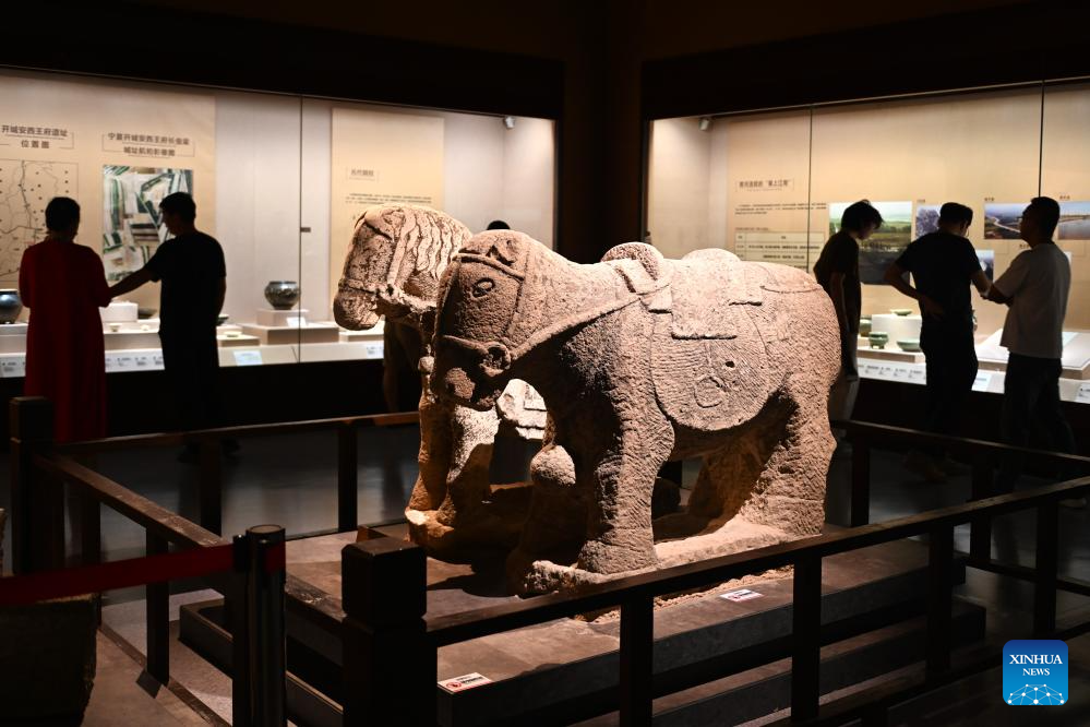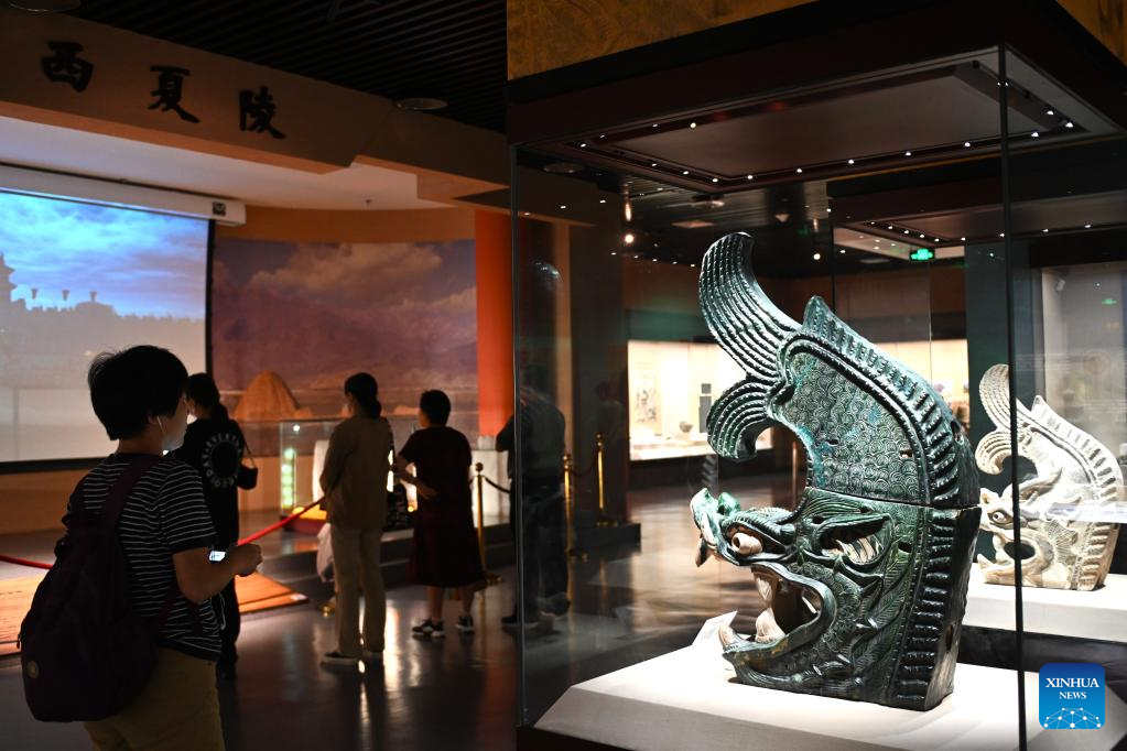 Tourists look at cultural relics of Xixia Dynasty (1038-1227), in Ningxia Museum in Yinchuan, capital of northwest China's Ningxia Hui Autonomous Region, Sept. 1, 2024. As one of China's national first-grade museums, Ningxia Museum showcases the rich culture and history of Ningxia. (Xinhua/Mao Zhu)