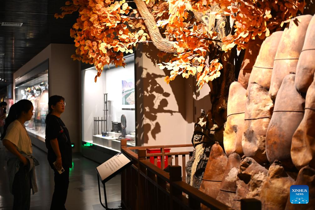 Tourists look at a sheepskin raft in Ningxia Museum in Yinchuan, capital of northwest China's Ningxia Hui Autonomous Region, Sept. 1, 2024. As one of China's national first-grade museums, Ningxia Museum showcases the rich culture and history of Ningxia. (Xinhua/Mao Zhu)