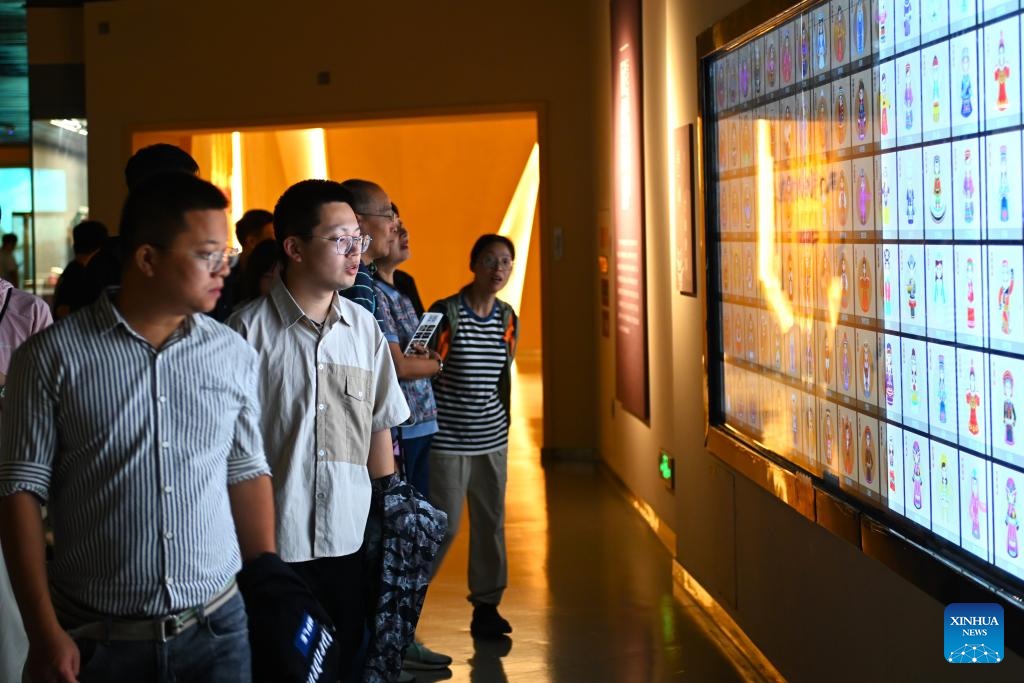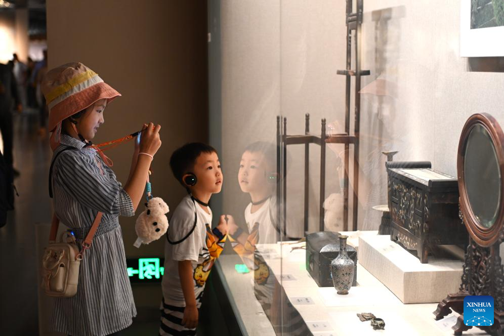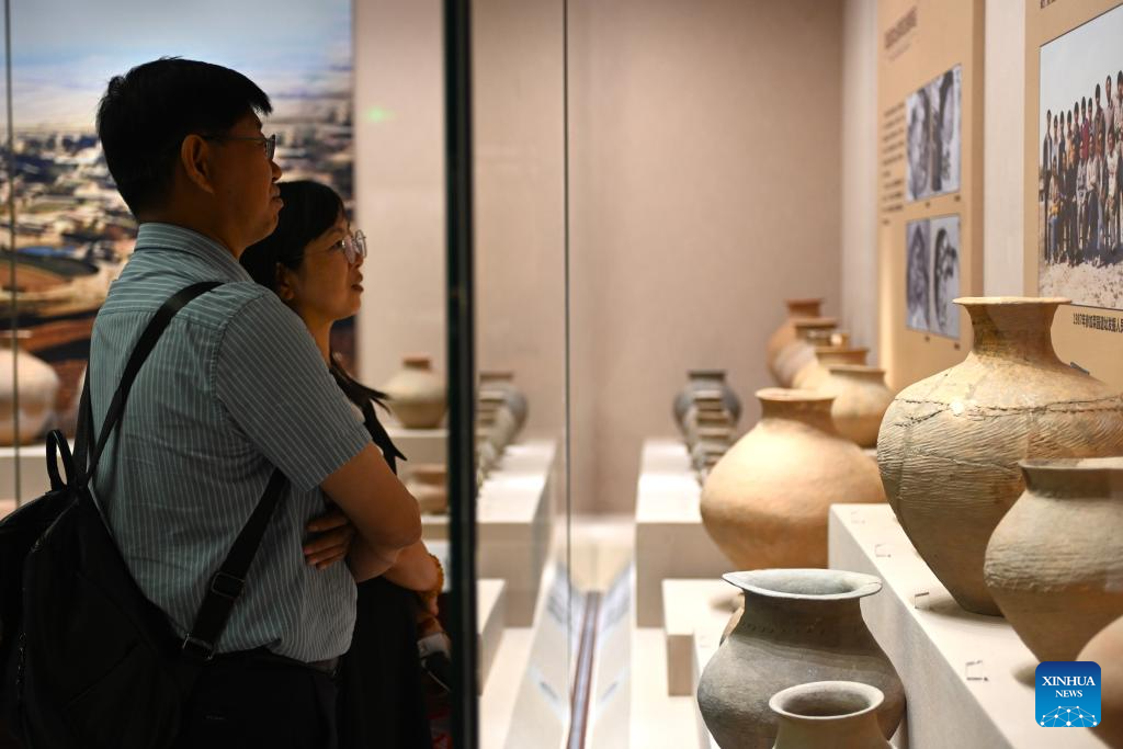 Tourists look at cultural relics in Ningxia Museum in Yinchuan, capital of northwest China's Ningxia Hui Autonomous Region, Sept. 1, 2024. As one of China's national first-grade museums, Ningxia Museum showcases the rich culture and history of Ningxia. (Xinhua/Mao Zhu)