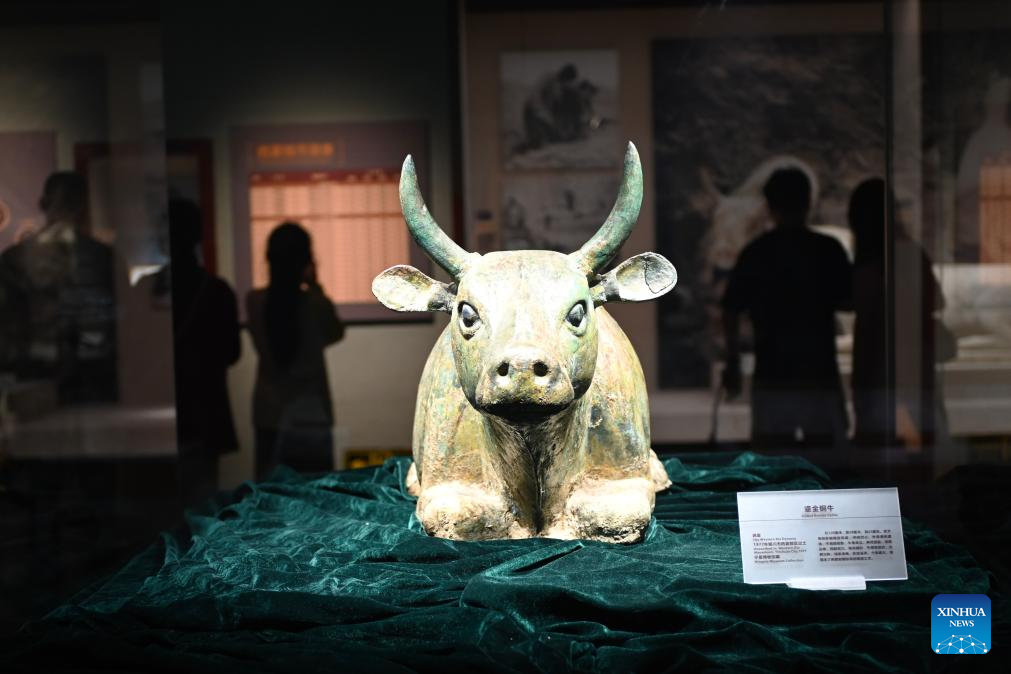 A gilded bronze cattle statue is seen in Ningxia Museum in Yinchuan, capital of northwest China's Ningxia Hui Autonomous Region, Sept. 1, 2024. As one of China's national first-grade museums, Ningxia Museum showcases the rich culture and history of Ningxia. (Xinhua/Mao Zhu)