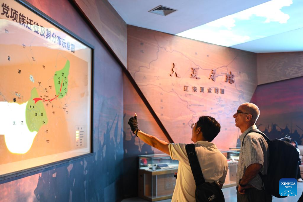 Tourists look at a historical map in Ningxia Museum in Yinchuan, capital of northwest China's Ningxia Hui Autonomous Region, Sept. 1, 2024. As one of China's national first-grade museums, Ningxia Museum showcases the rich culture and history of Ningxia. (Xinhua/Mao Zhu)