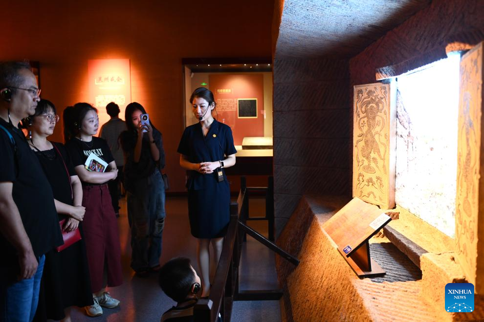 Tourists look at a gate of an ancient tomb in Ningxia Museum in Yinchuan, capital of northwest China's Ningxia Hui Autonomous Region, Sept. 1, 2024. As one of China's national first-grade museums, Ningxia Museum showcases the rich culture and history of Ningxia. (Xinhua/Mao Zhu)