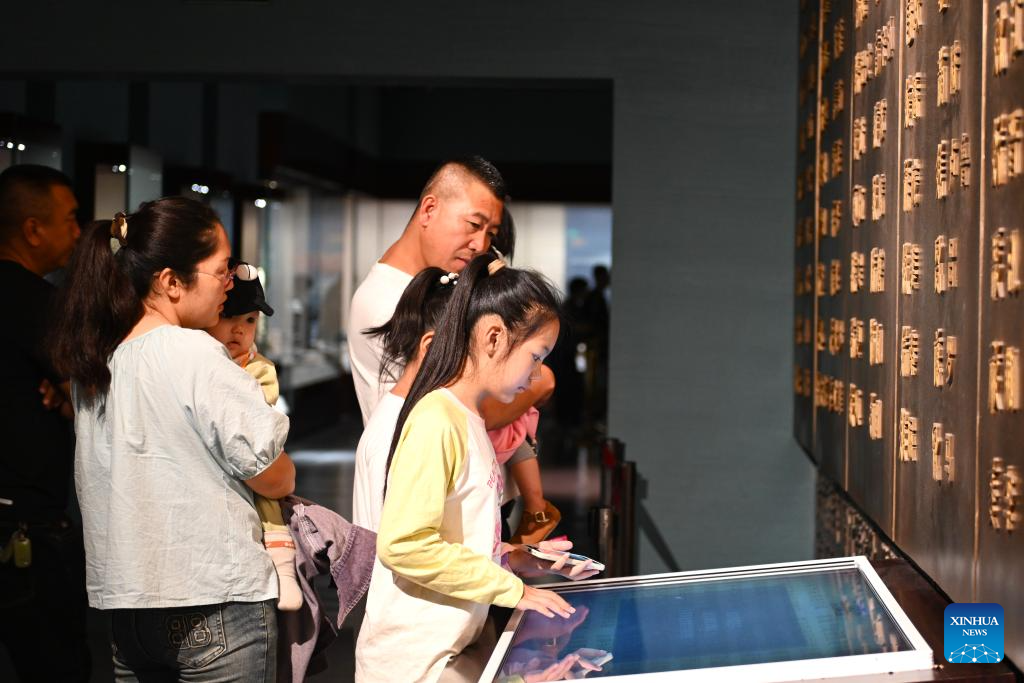 Tourists look at ancient characters in Ningxia Museum in Yinchuan, capital of northwest China's Ningxia Hui Autonomous Region, Sept. 1, 2024. As one of China's national first-grade museums, Ningxia Museum showcases the rich culture and history of Ningxia. (Xinhua/Mao Zhu)