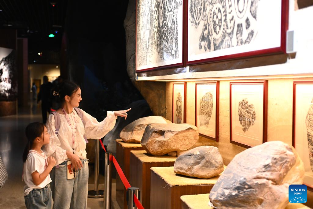 Tourists look at the petroglyphs in Ningxia Museum in Yinchuan, capital of northwest China's Ningxia Hui Autonomous Region, Sept. 1, 2024. As one of China's national first-grade museums, Ningxia Museum showcases the rich culture and history of Ningxia. (Xinhua/Mao Zhu)