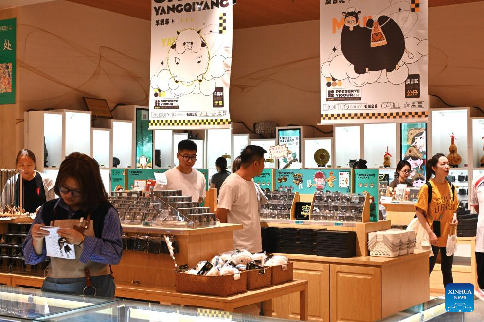 Tourists visit the gift shop in Ningxia Museum in Yinchuan, capital of northwest China's Ningxia Hui Autonomous Region, Sept. 1, 2024. As one of China's national first-grade museums, Ningxia Museum showcases the rich culture and history of Ningxia. (Xinhua/Mao Zhu)