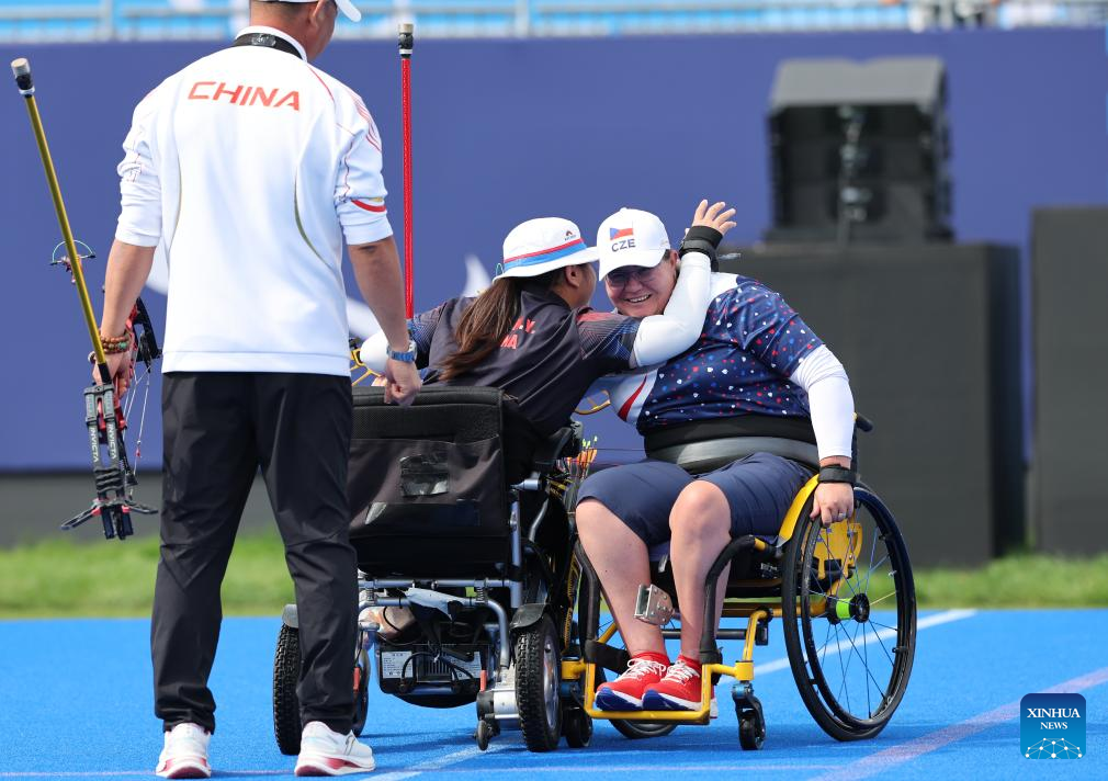 Chen Minyi (C) of China hugs Sarka Pultar Musilova of the Czech Republic after their para archery women's individual W1 gold medal match at the Paris 2024 Paralympic Games in Paris, France, Aug. 31, 2024. (Xinhua/Hou Jun)