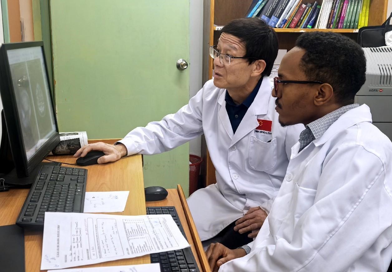 Head of the 17th Chinese medical team to Eritrea discusses treatment plans with an Eritrean doctor at the Orotta Hospital, Eritrea. (People's Daily/Ren Yan/)
