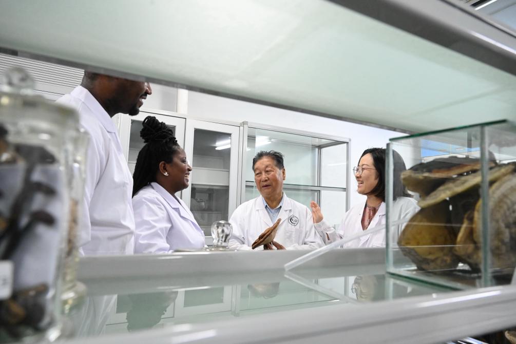 Lin Zhanxi (2nd R) and his daughter Lin Dongmei (1st R) introduce Juncao technology to Rwandan students at Fujian Agriculture and Forestry University in Fuzhou, southeast China's Fujian Province, Aug. 26, 2024. (Xinhua/Lin Shanchuan)