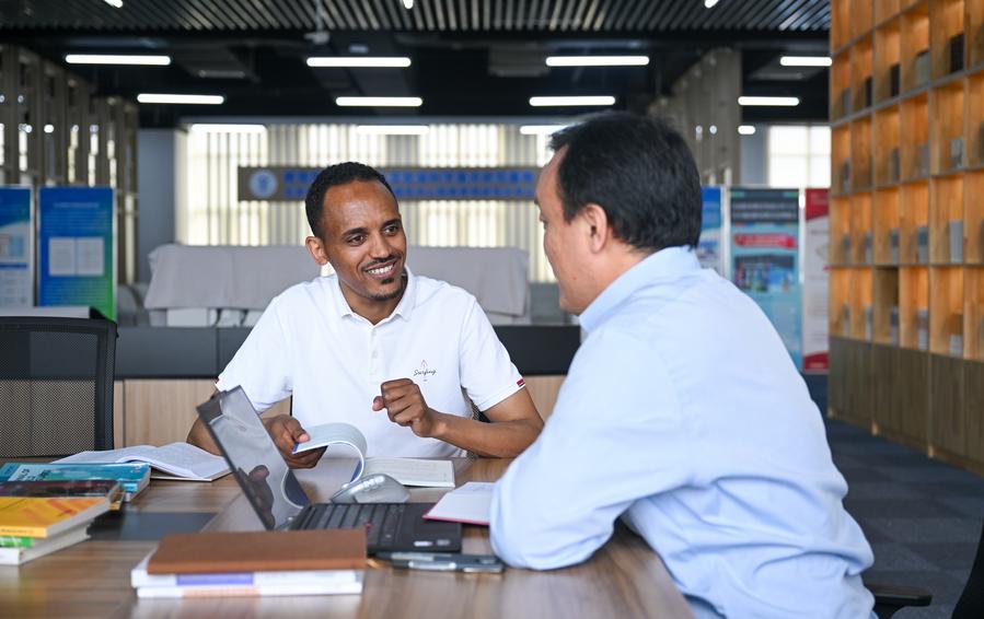 Tola Tsegaye Alemu (L), a 34-year-old Ethiopian, discusses with doctoral supervisor Mi Jing in Tianjin University of Technology and Education in north China's Tianjin, June 27, 2024. (Xinhua/Sun Fanyue)
