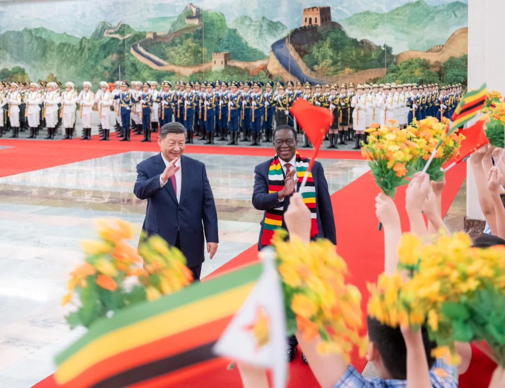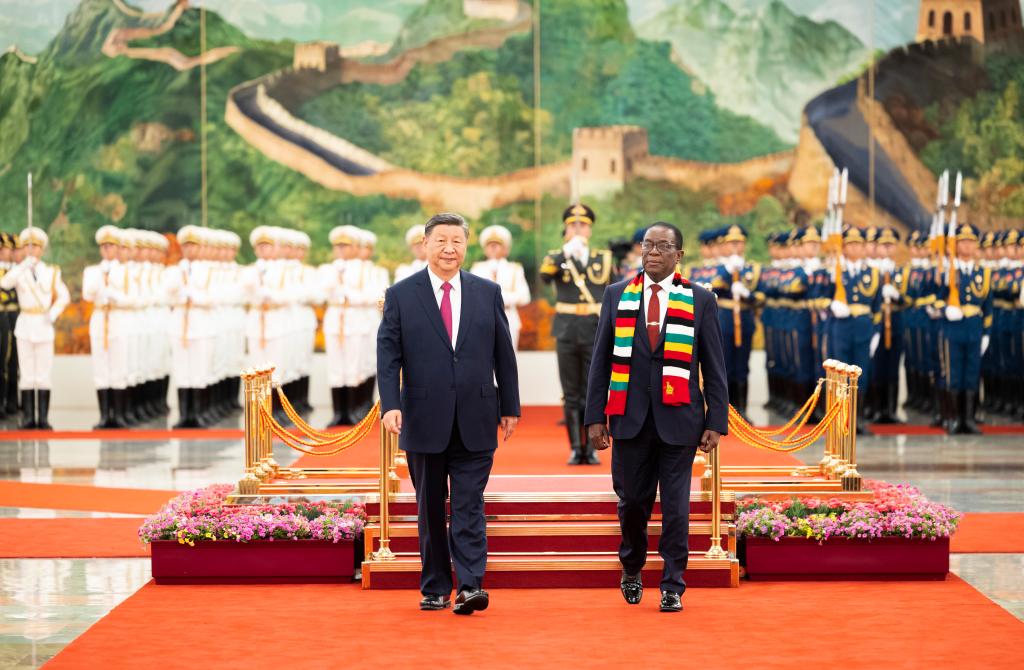 Chinese President Xi Jinping holds a welcoming ceremony for Zimbabwean President Emmerson Mnangagwa, who is in Beijing for the 2024 Summit of the Forum on China-Africa Cooperation (FOCAC) and a state visit, in the Northern Hall of the Great Hall of the People prior to their talks in Beijing, capital of China, Sept. 3, 2024. Xi held talks with Mnangagwa at the Great Hall of the People in Beijing on Tuesday. (Xinhua/Zhai Jianlan)