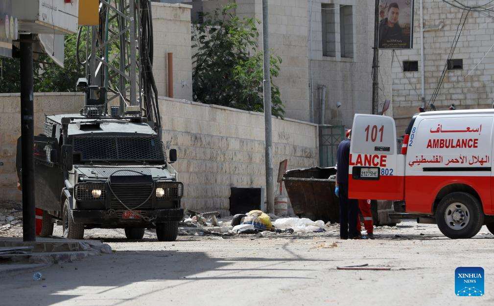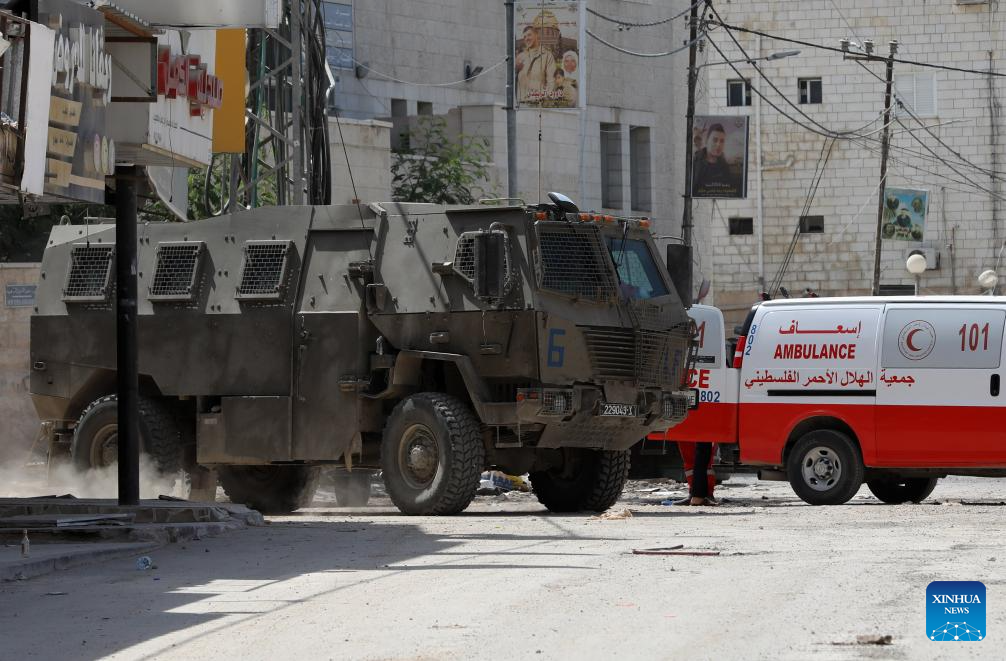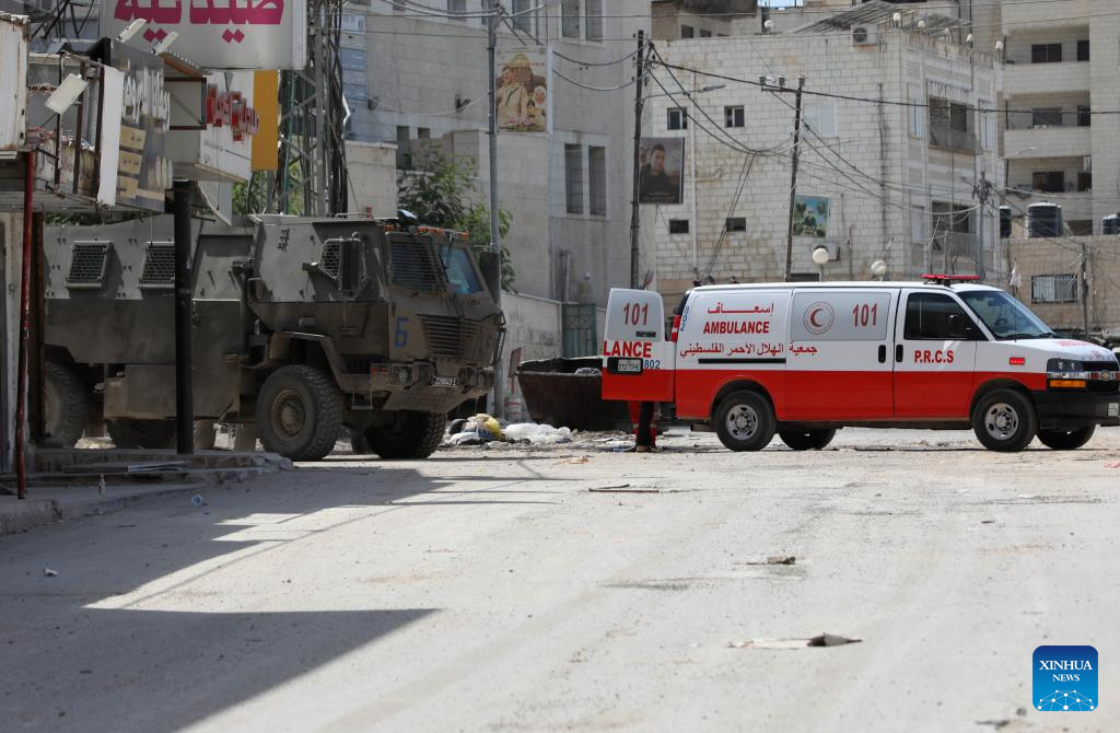An Israeli military vehicle is seen near an ambulance during a military operation in the northern West Bank city of Jenin, on Sept. 3, 2024. The ongoing Israeli military operations across the West Bank have killed 29 Palestinians and wounded 121 others, the Palestinian Health Ministry said on Monday. (Photo by Ayman Nobani/Xinhua)