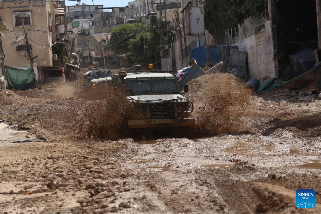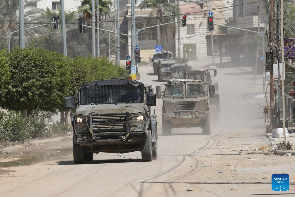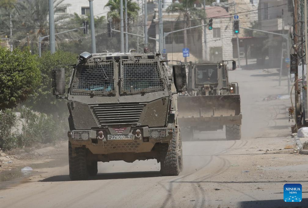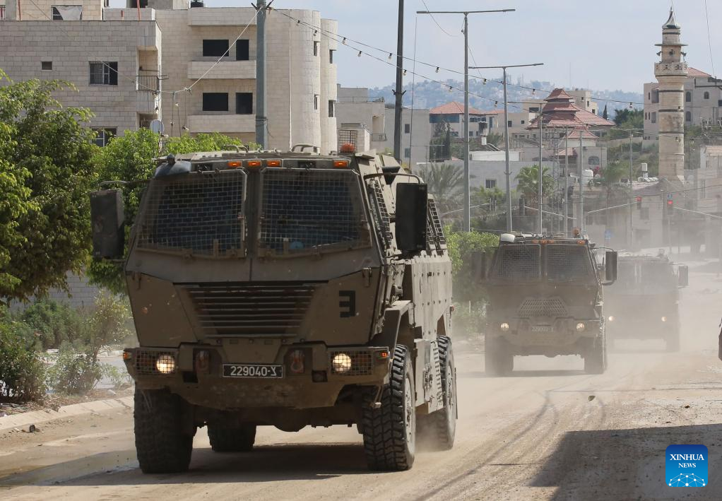 Israeli military vehicles are seen on a street during an Israeli operation in the refugee camp of Tulkarm in the northern West Bank, on Sept. 3, 2024. The Israeli army killed a Palestinian teenager in the West Bank city of Tulkarm on Tuesday, Palestinian medical sources said. (Photo by Nidal Eshtayeh/Xinhua)