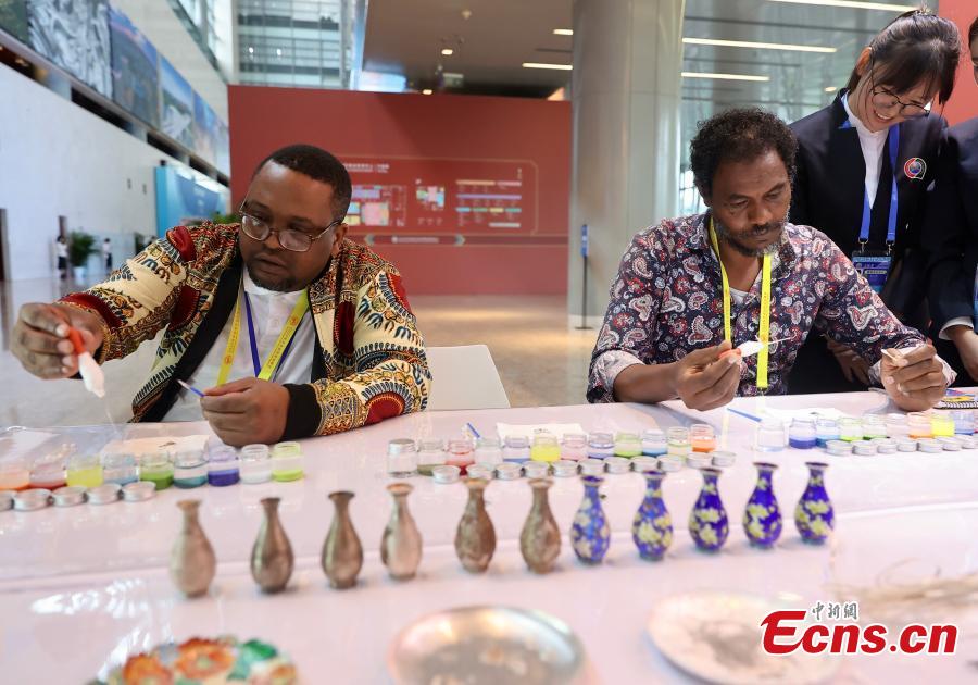 Journalists from Africa experience cloisonne crafting at the exhibition area of the Press Center for the 2024 Summit of the Forum on China-Africa Cooperation (FOCAC) in Beijing, Sept. 4, 2019. (Photo: China News Service / Yi Haifei)