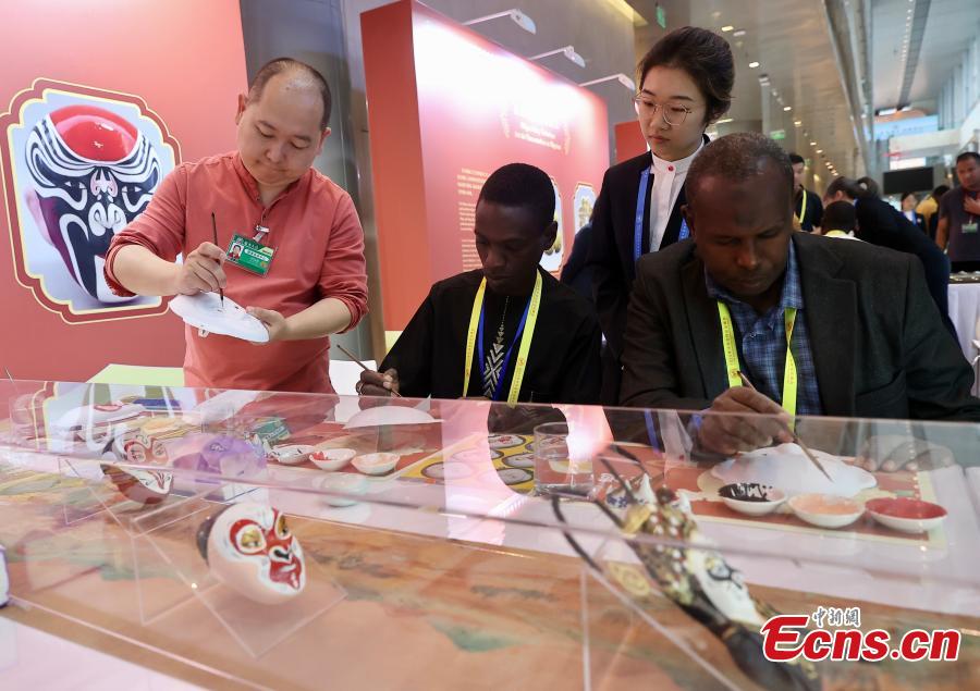 Journalists from Africa experience Beijing Opera face crafting at the exhibition area of the Press Center for the 2024 Summit of the Forum on China-Africa Cooperation (FOCAC) in Beijing, Sept. 4, 2019. (Photo: China News Service / Yi Haifei)
