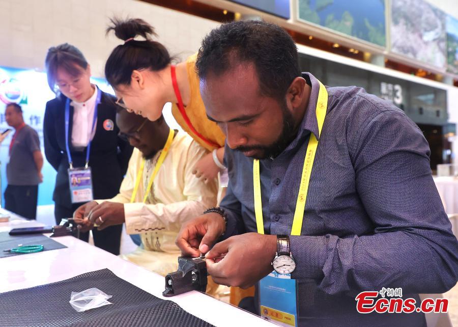 Journalists from Africa experience filigree crafting at the exhibition area of the Press Center for the 2024 Summit of the Forum on China-Africa Cooperation (FOCAC) in Beijing, Sept. 4, 2019. (Photo: China News Service / Yi Haifei)