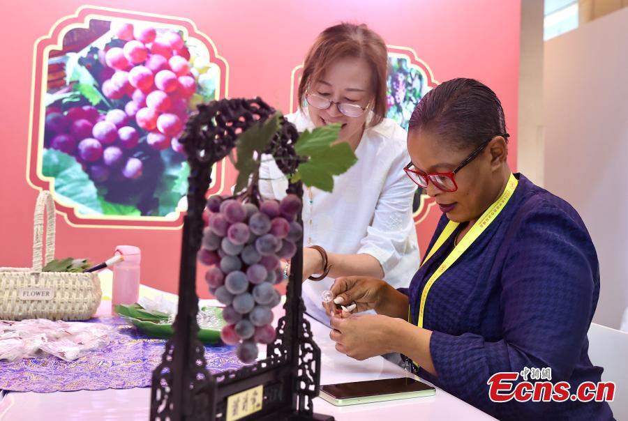 A journalist from Africa experiences crafting a grape-shaped glass artwork at the exhibition area of the Press Center for the 2024 Summit of the Forum on China-Africa Cooperation (FOCAC) in Beijing, Sept. 4, 2019. (Photo: China News Service / Yi Haifei)
