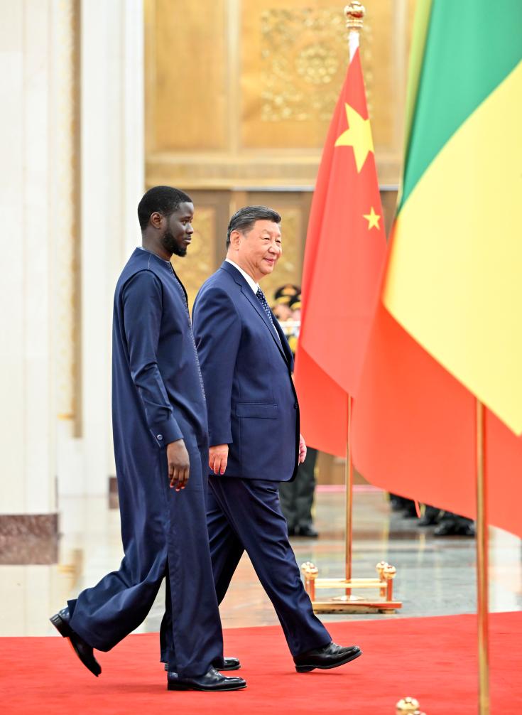Chinese President Xi Jinping holds a welcoming ceremony for Senegalese President Bassirou Diomaye Faye, who is in Beijing for the 2024 Summit of the Forum on China-Africa Cooperation (FOCAC) and a state visit, in the Northern Hall of the Great Hall of the People prior to their talks in Beijing, capital of China, Sept. 4, 2024. Xi held talks with Faye at the Great Hall of the People in Beijing on Wednesday. (Xinhua/Li Tao)