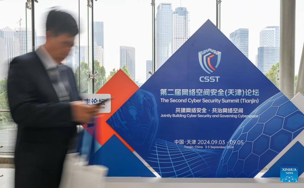 This photo shows the second Cyber Security Summit (Tianjin) (CSST) in north China's Tianjin municipality, Sept. 4, 2024. The second CSST is held here under the theme "Jointly Building Cyber Security and Governing Cyberspace." (Xinhua/Sun Fanyue)