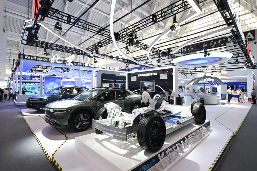 Automobiles are displayed at the World Intelligence Expo 2024 in north China's Tianjin, June 20, 2024. (Xinhua/Sun Fanyue)