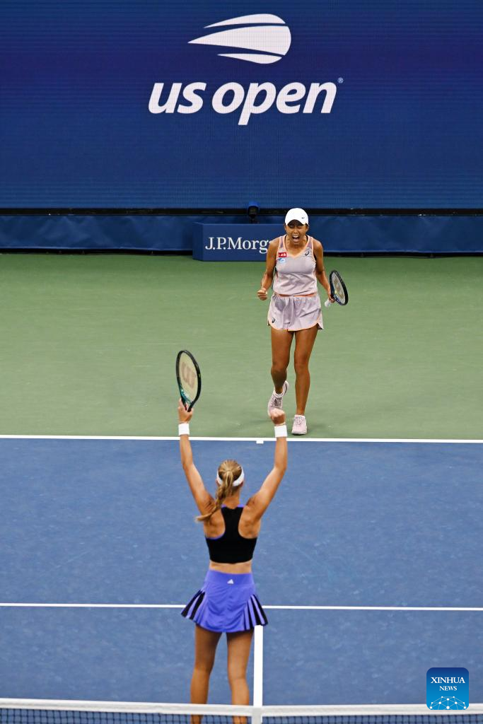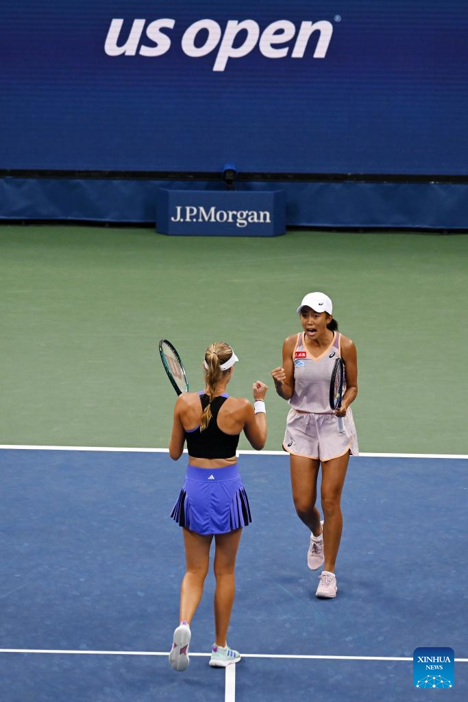 Zhang Shuai (L) and Kristina Mladenovic celebrate after the women's semi-final match between Zhang Shuai of China/Kristina Mladenovic of France and Katerina Siniakova of the Czech Republic/Taylor Townsend of the United States at the 2024 US Open tennis championships in New York, the United States, Sept. 4, 2024. (Xinhua/Li Rui)