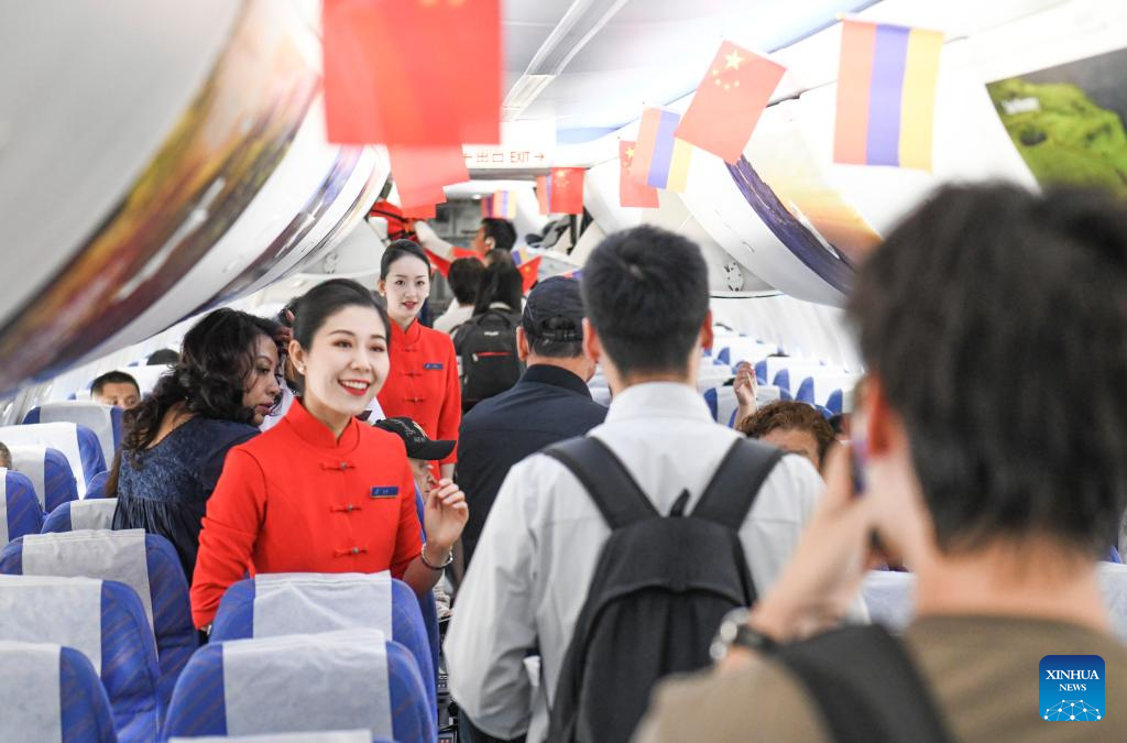 Passengers board flight CZ5091 of China Southern Airlines, which is bound for Yerevan of Armenia, at Urumqi Diwopu International Airport in Urumqi, northwest China's Xinjiang Uygur Autonomous Region. (Photo/Xinhua)