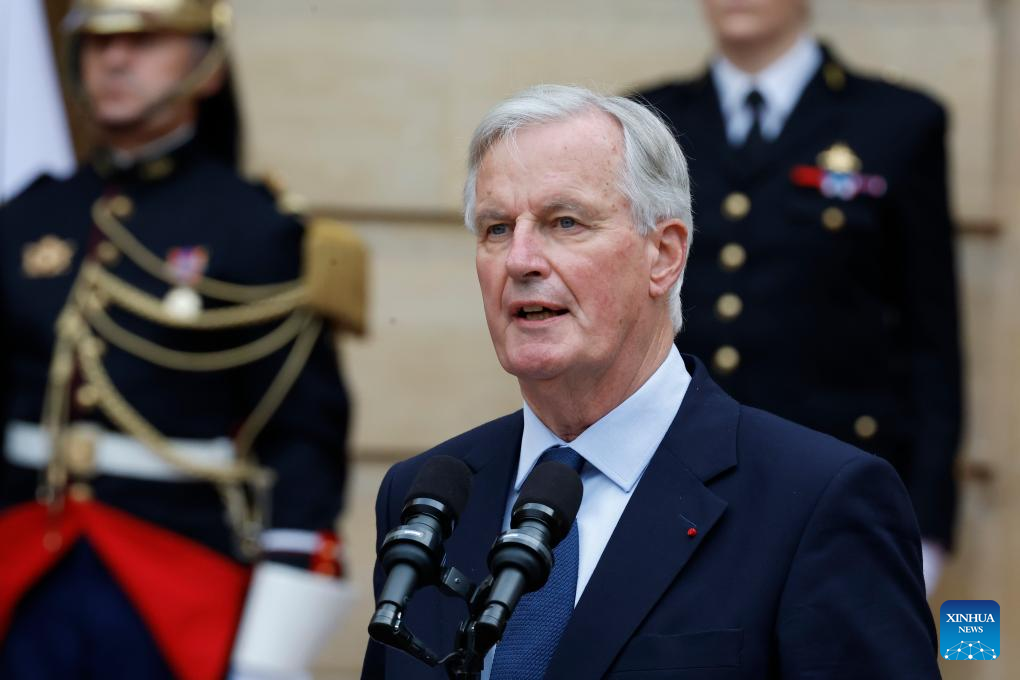 Newly appointed Prime minister Michel Barnier speaks at a handover ceremony at the Hotel Matignon in Paris, France, on Sept. 5, 2024. French President Emmanuel Macron has nominated former Brexit negotiator Michel Barnier as the new prime minister, the Elysee announced on Thursday. (Photo by Henri Szwarc/Xinhua)